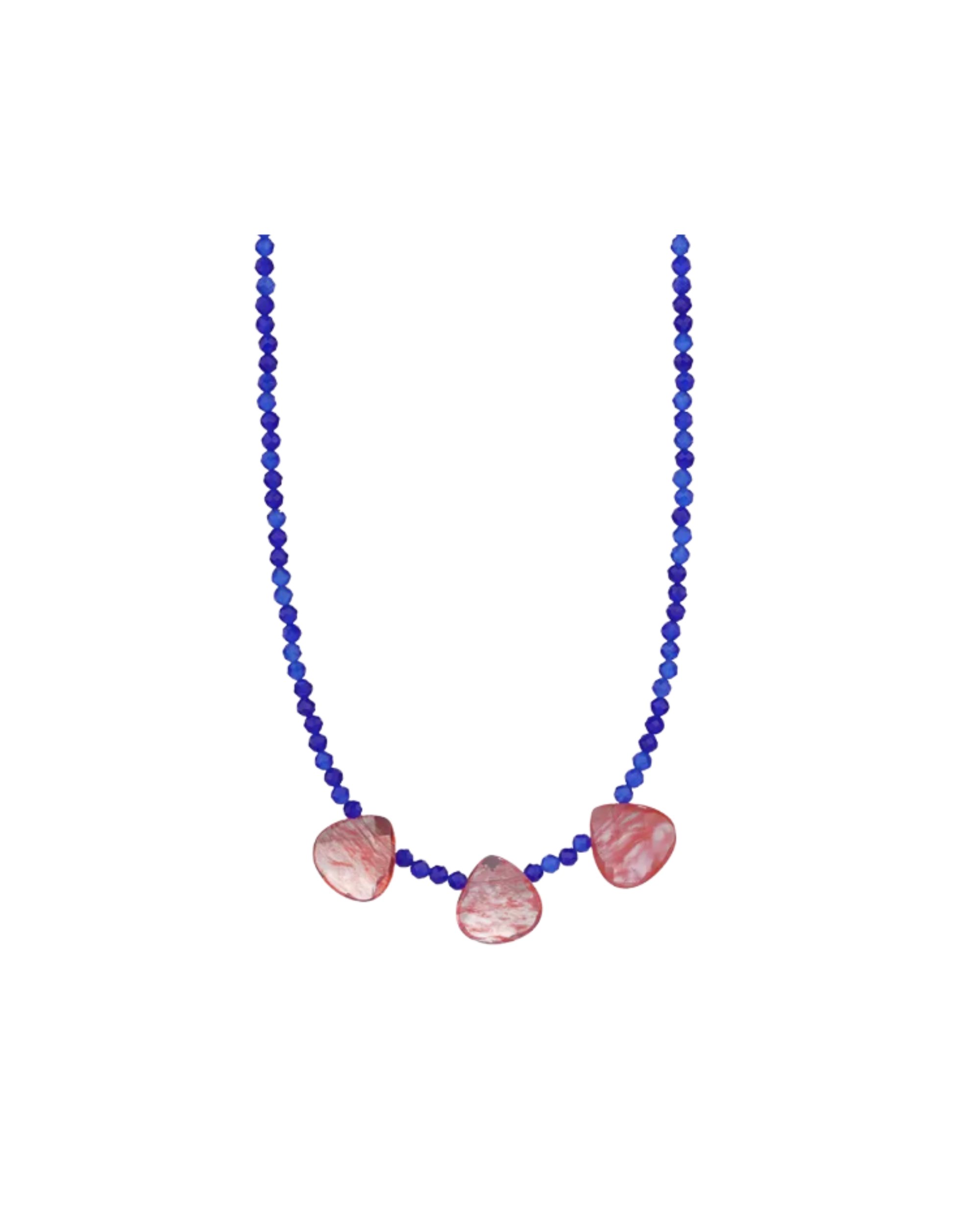 Sparkle like a Grecian Goddess in our Athena Necklace. This captivating piece features a delicate yet vibrant strand of rich sapphire-blue faceted beads, reminiscent of the deep Aegean Sea. Along the front, three beautifully irregular, translucent blush-pink gemstones are artfully interspersed, their soft hues providing a stunning contrast and a touch of serene femininity.