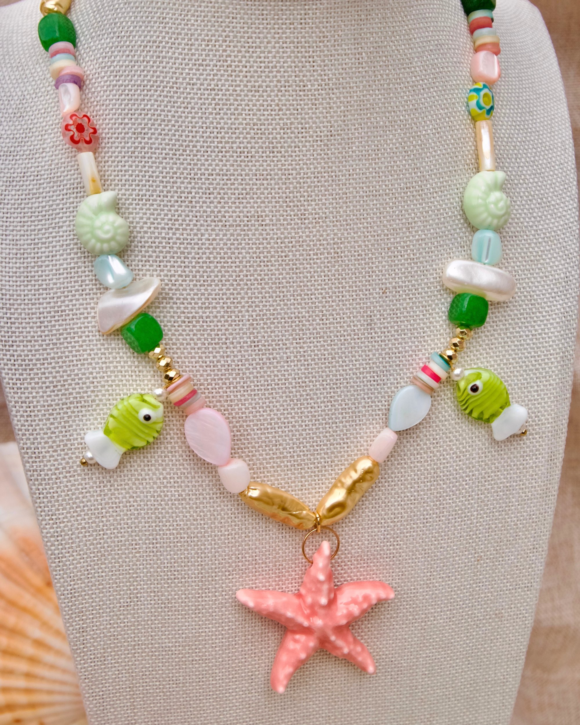 The undeniable centerpiece is a prominent and beautifully textured pink starfish pendant, serving as the central focal point.