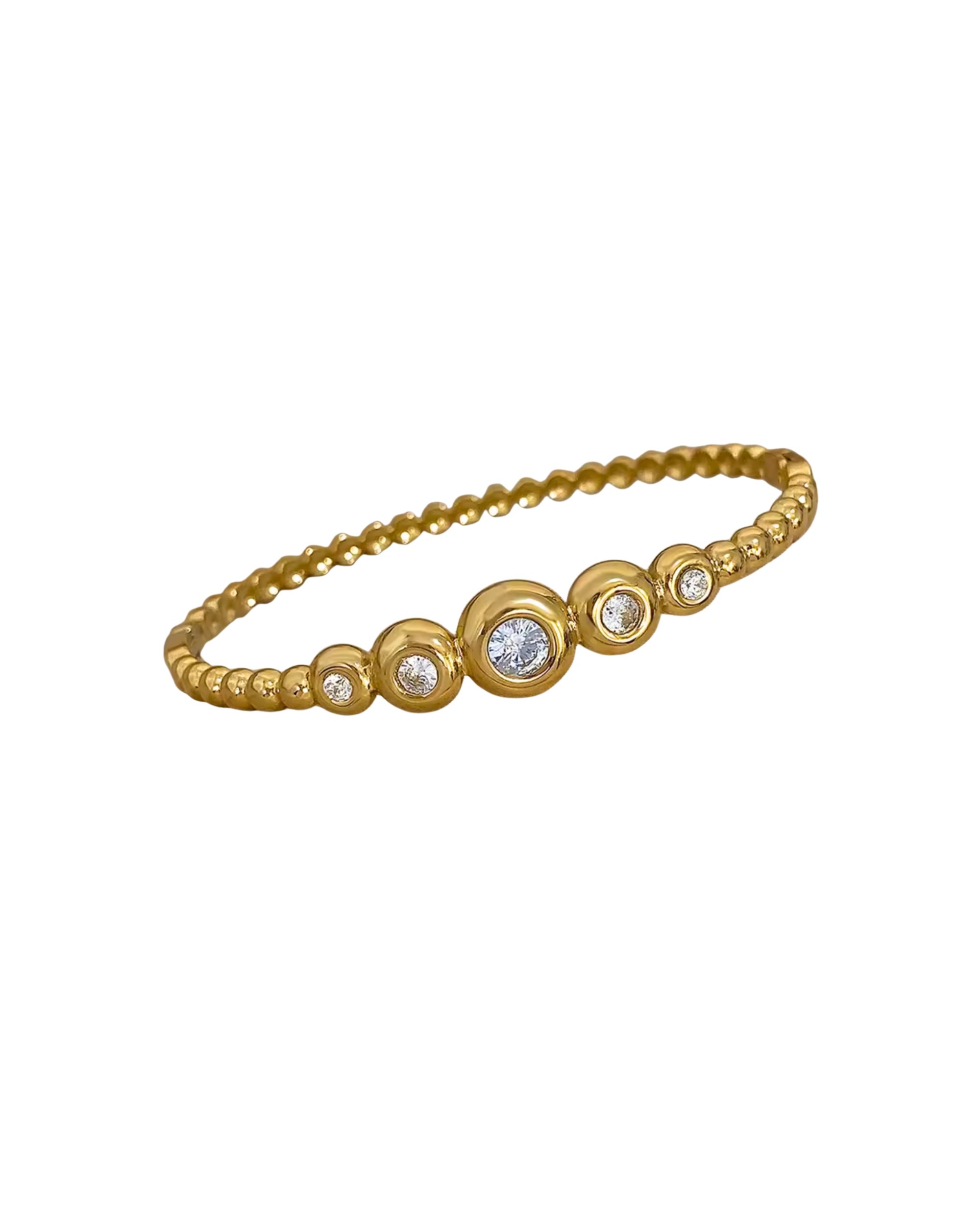 Delicate and versatile, the Lilia Bangle features a slim beaded gold-tone band accented at the centre with five graduating gemstones, adding a refined touch of sparkle. Perfect for stacking or wearing solo.