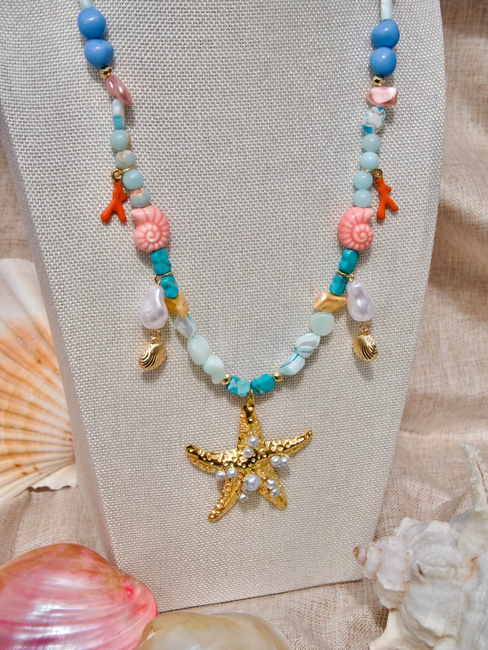 The undeniable centerpiece is a magnificent, textured golden starfish pendant, adorned with shimmering pearls and delicate details that catch the light beautifully.