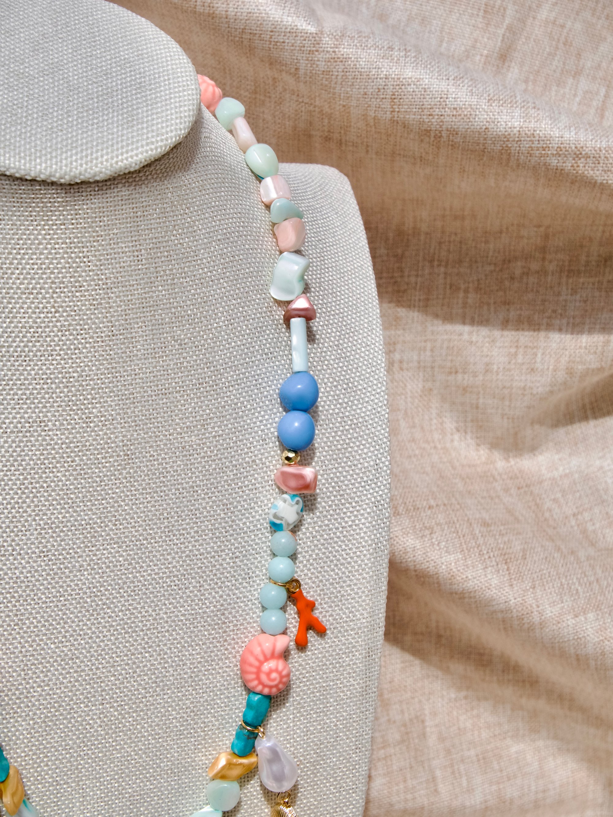 This eye-catching necklace features a rich blend of beads in refreshing blues, soft aquas, and natural cream tones, interspersed with delicate pink shell beads and vibrant coral-hued accents. The varied shapes and textures, from smooth rounds to organic chips, evoke the diverse treasures found beneath the waves.