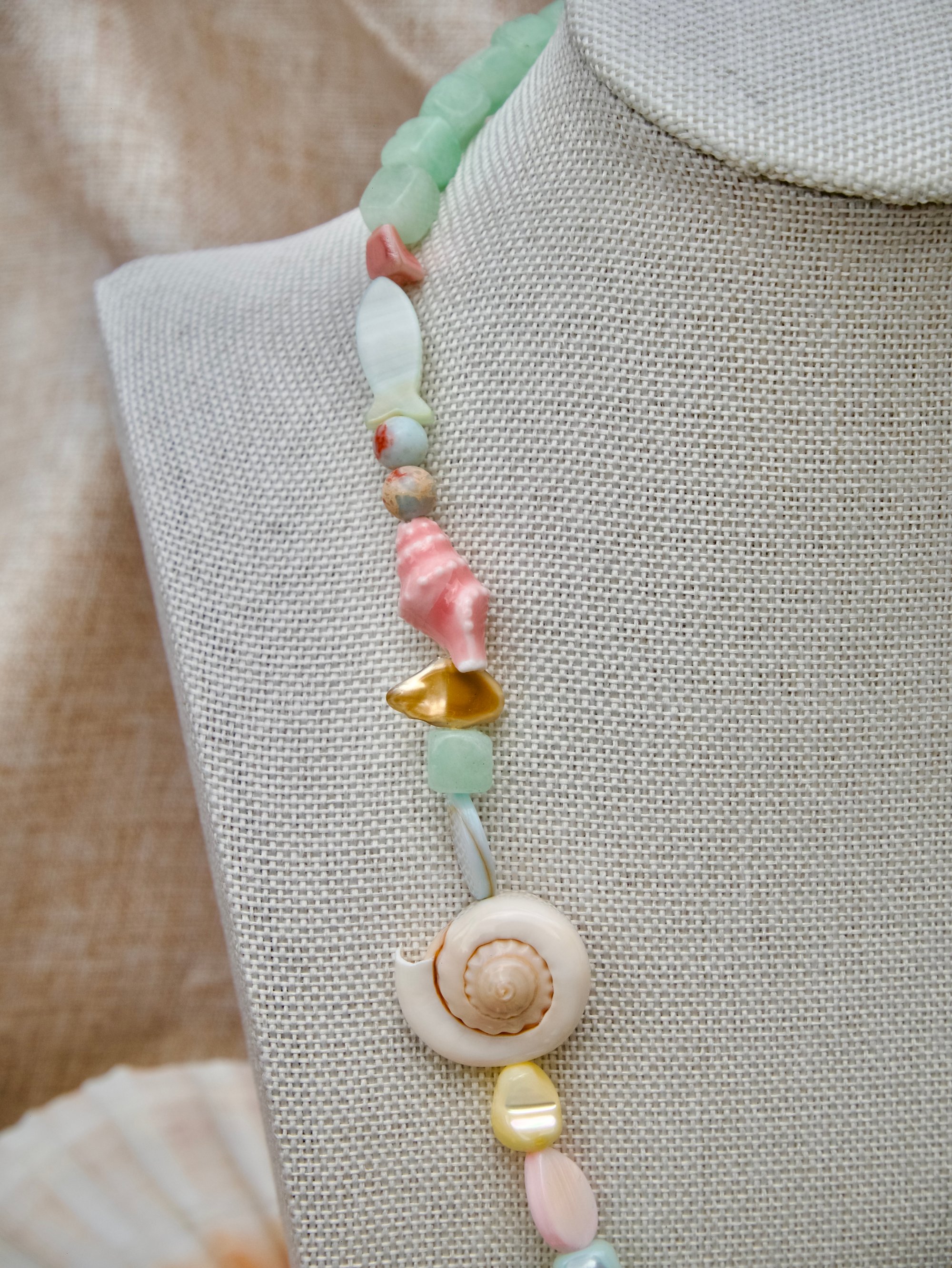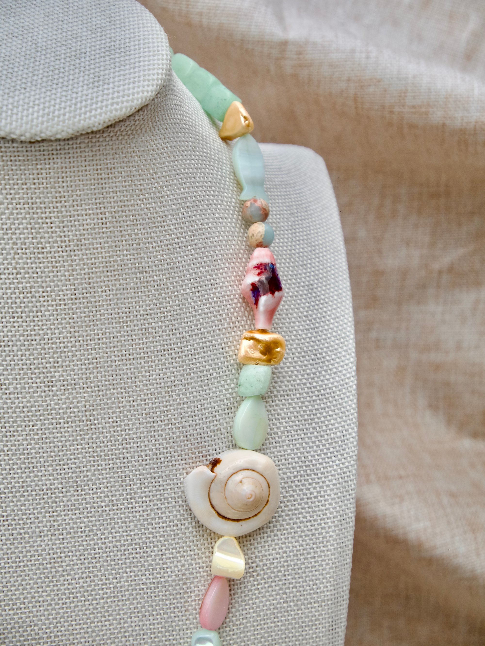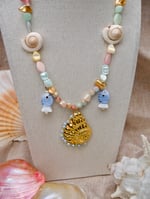 Drift to a serene coastline with our Nereida Necklace. This delightful piece combines soft pastel beads (greens, pinks & blues) with charming marine elements.