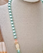 Dive into marine splendor with our Sereia necklace. This charming piece features lustrous aqua-blue pearls accented with delicate peach tones and natural shell chips, setting the stage for a captivating collection of sea-inspired treasures.