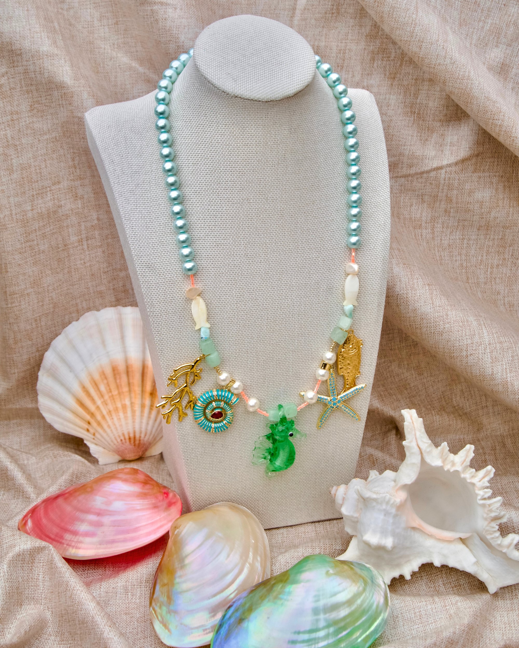 Discover an array of intricate charms: a sparkling golden starfish, a graceful golden fish, an elegant coral branch, a vibrant aqua conch shell, and a playful green seahorse. Each element comes together to form a unique, whimsical statement of coastal elegance.